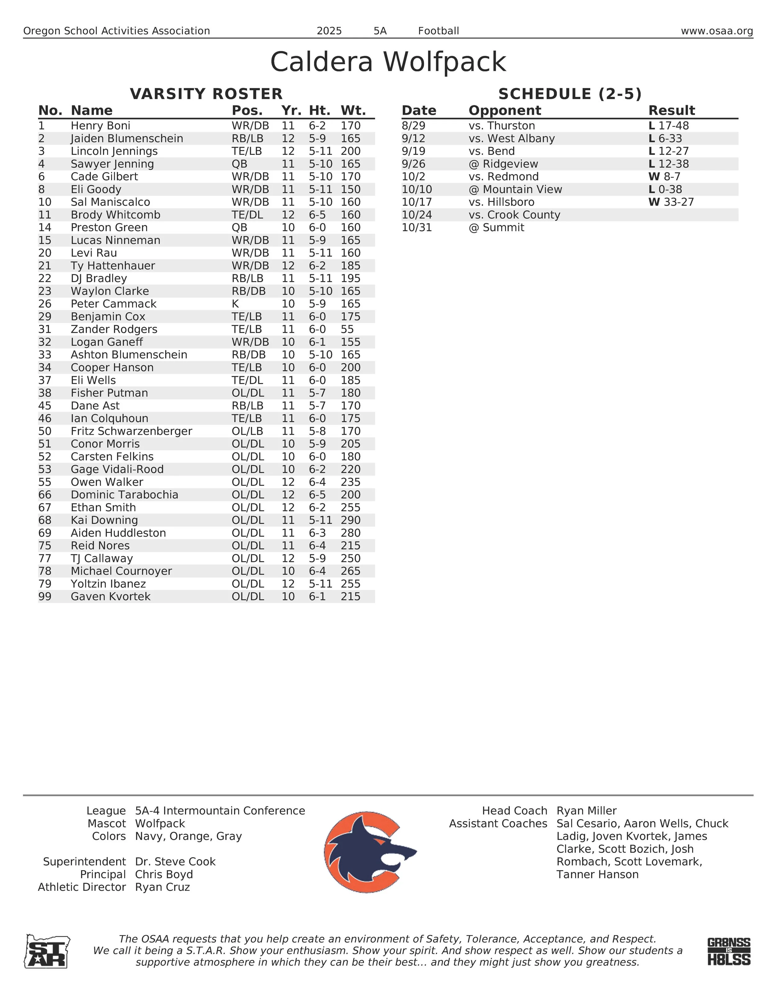 Josh Rombach (WR Coach)- 1st year with Caldera. Southern Oregon native. Prior professional basketball player. Works locally in the school district.
